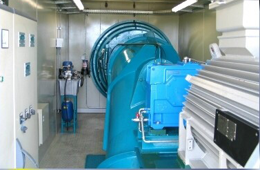 Its mounting inside the container considerably facilitates the hydroelectric power plant’s transportation, installation and commissioning. Not only does the container serve as a transportation container, it also replaces the building which until now, has been necessary onsite. The container allows the hydroelectric power plant to be completely pre-installed and tested by the manufacturer. This means that no specially trained personnel are required at the operating site. Being pre-installed, the invented device constitutes an operational, compact power plant. The entire power plant is mobile and can be located temporarily at sites where it is neither necessary nor financially viable to install a permanent power supply. Where diesel generators are virtually the only power generation devices used, it also avoids the troublesome noise and exhaust fumes that these give off.